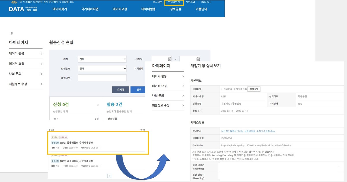 그림2: 금융위원회 주식시세 정보 활용신청 이후 마이페이지 화면 -> 좌측 데이터 활용 -> OpenAPI -> 활용신청 현황을 조회하면 아래 그림 3처럼 내가 신청한 API 목록이 나오고 목록을 클릭하면 개발계정 상세 보기 화면을 볼 수 있다.