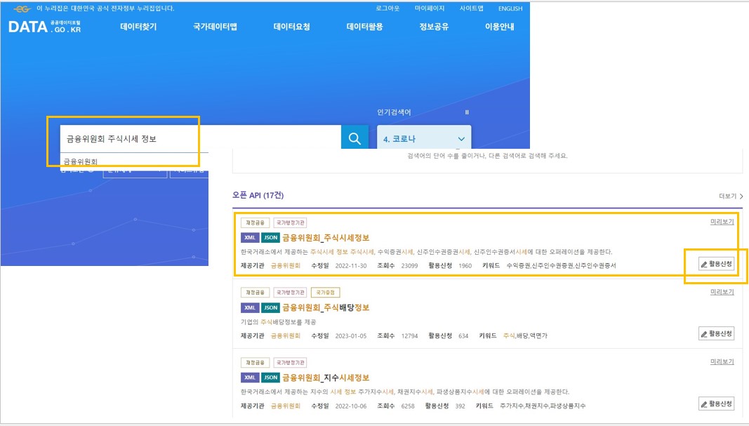 주식코드별로 그림 1과 같은 URL을 만들려면 먼저 KOSPI, KOSDAQ, KONEX의 주식목록을 알아야 한다. 주식목록과 종가는 공공데이터 포털(https://www.data.go.kr)에서 API로 제공해 주고 있다. 공공데이터포털 회원가입 후 로그인 한 뒤 아래 그림 2와 같이 검색하여 활용신청 절차를 거치면 공공데이터 포털 API 중 "주식시세정보"를 활용할 수 있는 상태가 된다.( 자세한 것은 (OpenAPI)DATA.GO.KR(공공데이터포털): 인증키 발급을 참조하면 된다.)