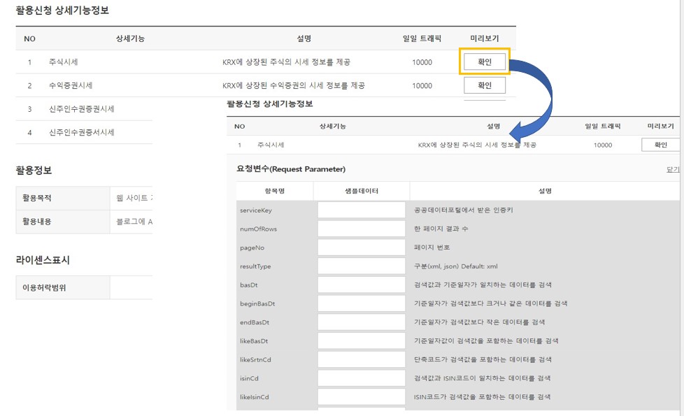 그림3: 개발계정 상세보기 확인 아래 그림 4처럼 해당화면에서 요청 URL 은 어떻게 되는지 요청시 parameter로는 뭘 넣을 수 있는지 등을 볼 수 있다. 그리고 직접 코딩을 짜보지 않아도 웹에서 API 요청도 간단하게 해 볼 수도 있다.